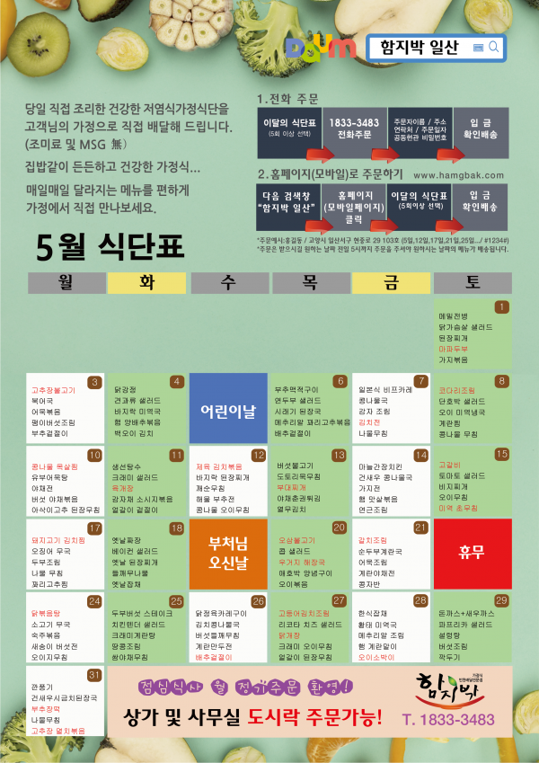 5월 식단표 페이지 정보 작성자 함지박 작성일21-04-25 조회2,225회 이전글 다음글 목록 본문 새로운 메뉴들 업테이트 했습니다. 많은 애용 부탁드립니다. ^^ 이전글 다음글 목록