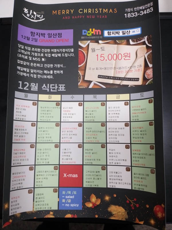 12월 식단표 페이지 정보 작성자 함지박 작성일19-11-12 조회2,605회 이전글 목록 본문 12월 식단표입니다. 정성으로 친절하게 모시겠습니다. 참고 하시고 많이 애용해 주세요. 이전글 목록