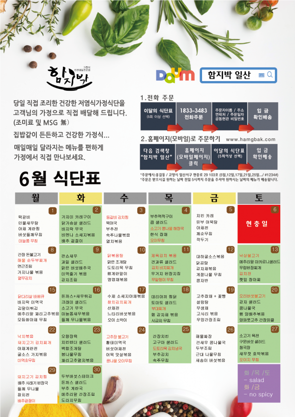 6월 식단표입니다. 많은 관심 부탁드립니다. ^^